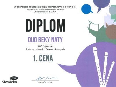 V národní soutěži ZUŠ ČR jsme se letos v hudebním oboru zapojili v komorní hře na dechové nástroje a duo BEKY NATY uspělo ve své I. kategorii až v krajském kole!