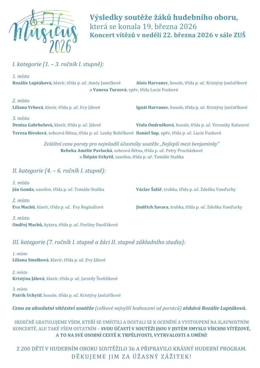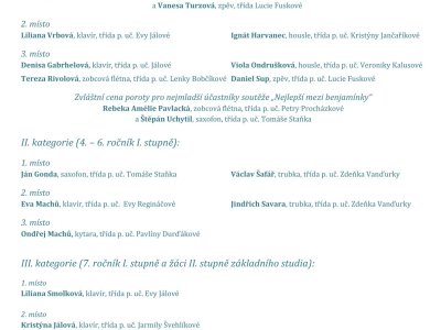 Soutěže se zúčastilo 35 žáků hudebního oboru naší ZUŠ (přihlášeno 36) a na nedělním koncertě se jich představilo 19 oceněných.