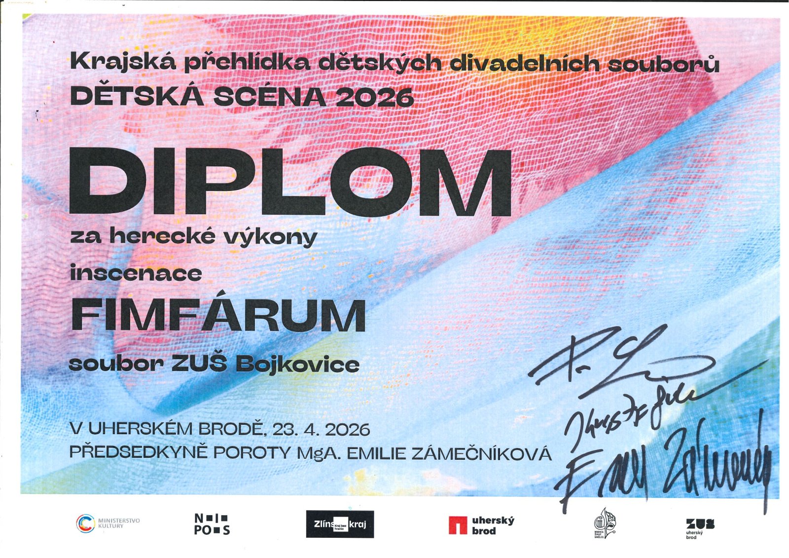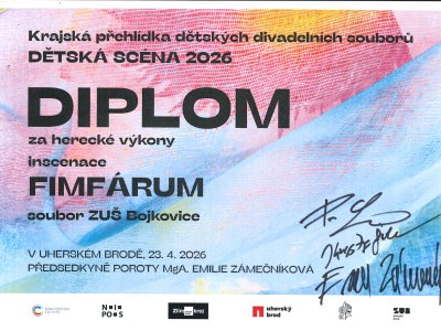 Soutěž LDO souborů "Dětská scéna" na krajské úrovni nám přinesla také jeden úspěch - mladší skupina s Fimfárem získala mezi 11 soubory diplom se zvláštním oceněním hereckých výkonů.