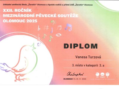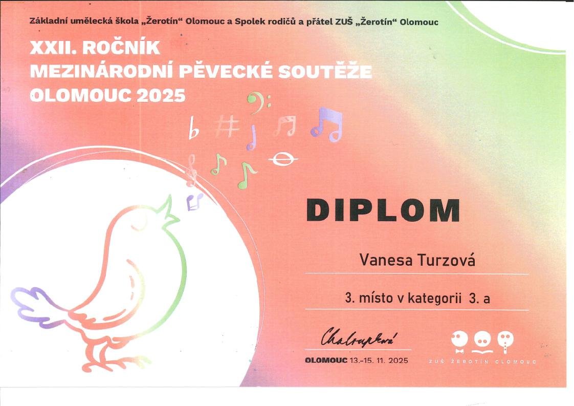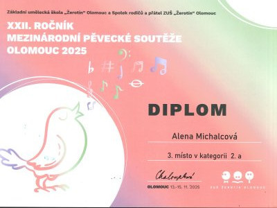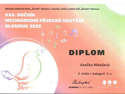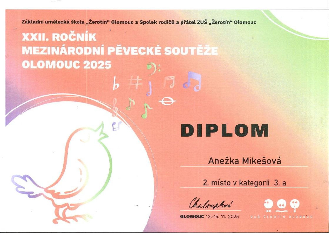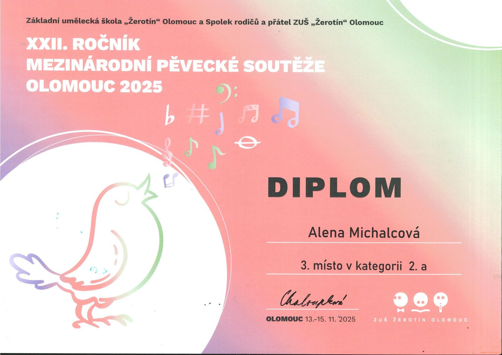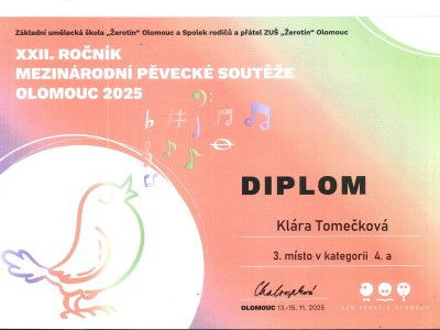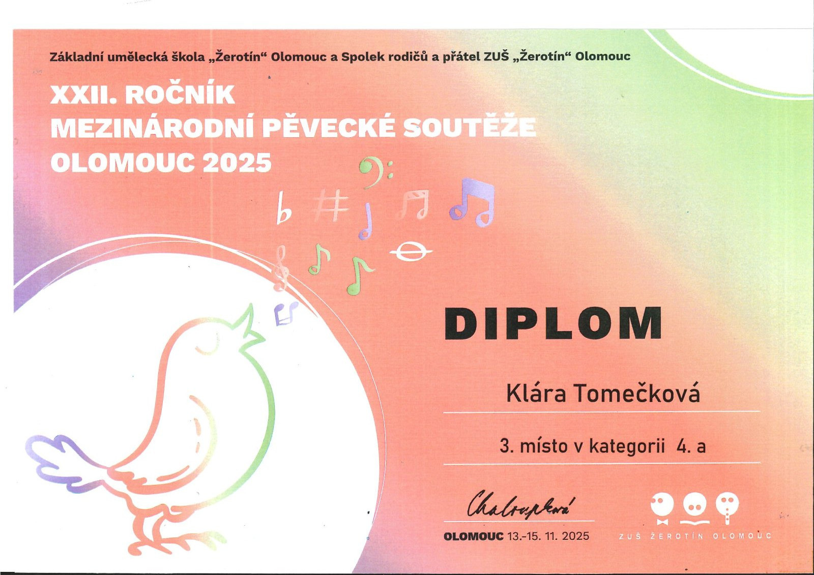 Ocenění v Mezinárodní pěvecké soutěži Olomouc 2025 získaly žákyně třídy p. uč. Lucie Fuskové: