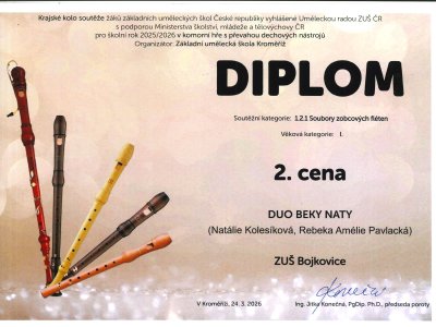 V hudebním oboru zazářilo naše duo zobcových fléten BEKY NATY, které postoupilo v Soutěži ZUŠ ČR z okresního do krajského kola a přivezlo si odtud 2. cenu! Také těmto žákyním - Rebece Amélii Pavlacké a Natálii Kolesíkové - gratulujeme, stejně jako jejich p. uč. - Petře Procházkové!